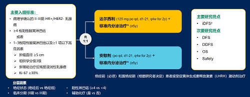 达尔西利(Dalpiciclib)是AG尊龙凯时医药自主研发的口服、选择性的小分子CDK4/6抑制剂,也是中国首个自主研发的新型高选择性 CDK4/6 抑制剂,已证实其与内分泌治疗(ET)联合用于 HR+/HER2- 晚期乳腺癌的一线和后线治疗时,均显著改善无进展生存期(PFS)6,7。因此开展了一项随机、双盲、III期临床试验(DAWNA-A),以进一步评估达尔西利联合内分泌治疗作为高危早期 HR+/HER2 - 乳腺癌辅助治疗的效果。本研究纳入高危复发风险人群需满足以下标准之一:①≥4 枚阳性腋窝淋巴结;②1–3枚阳性腋窝淋巴结且合并≥1 项高危因素(肿瘤直径 ≥5 cm,组织学分级3级,辅助治疗后残留浸润性乳腺癌,Ki-67 ≥30%)。本文呈现预先设定的首次中期分析(IA1)结果。